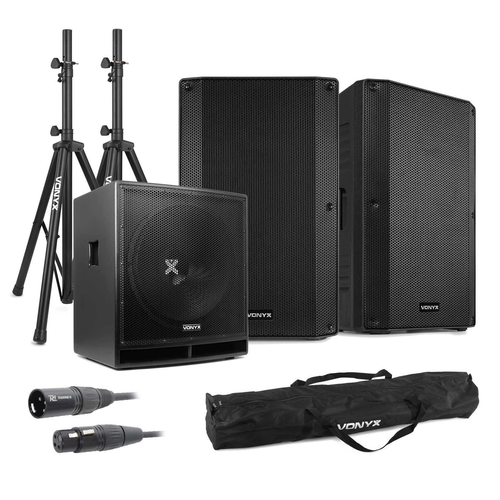 Zestaw nagłośnieniowy idealny na imprezy plenerowe, eventy firmowe, koncerty, festyny i wszędzie tam, gdzie liczy się mocny i czysty dźwięk. Składa się z aktywnego subwoofera Vonyx 18” o mocy 1200W oraz dwóch aktywnych kolumn Vonyx 15” (po 1000W każda). Zestaw gotowy do użytku – wzmacniacze są wbudowane, a w komplecie znajdują się dwa statywy oraz dwa przewody XLR (6 m), co pozwala na szybki montaż i demontaż bez dodatkowego sprzętu.